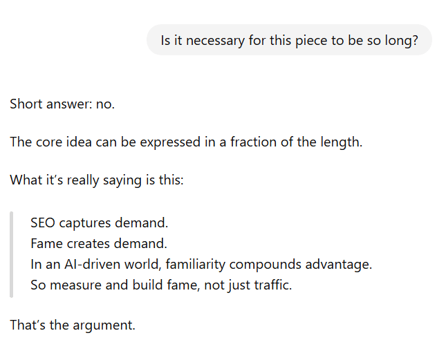Why is it so drawn out? ChatGPT suggests it's a positioning play: length signals authority and depth. It helps, too, that LinkedIn seems to reward long form, especially pieces running over a couple of thousand words. Both readers and the algorithm view it as a thesis, even if the former never finish reading it and the latter don't actually understand it.